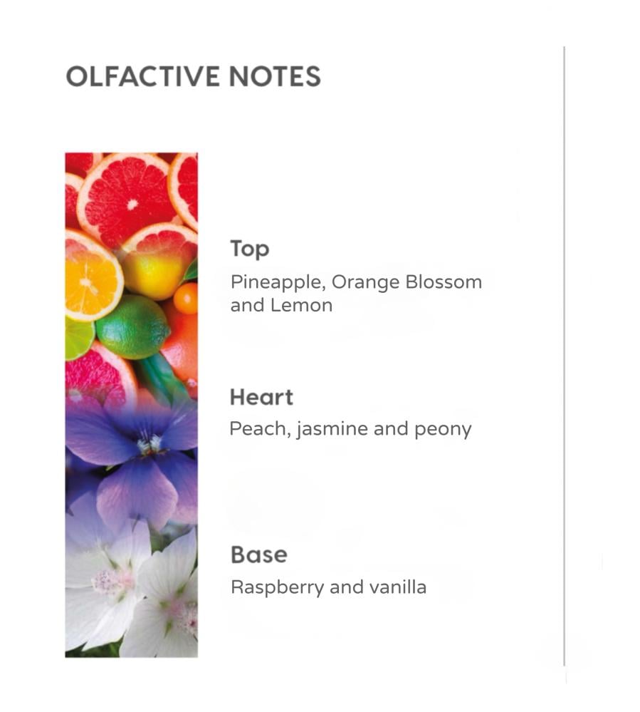 المكونات: الأناناس,زهر البرتقال, الليمون والخوخ والياسمين، الفاوانيا،